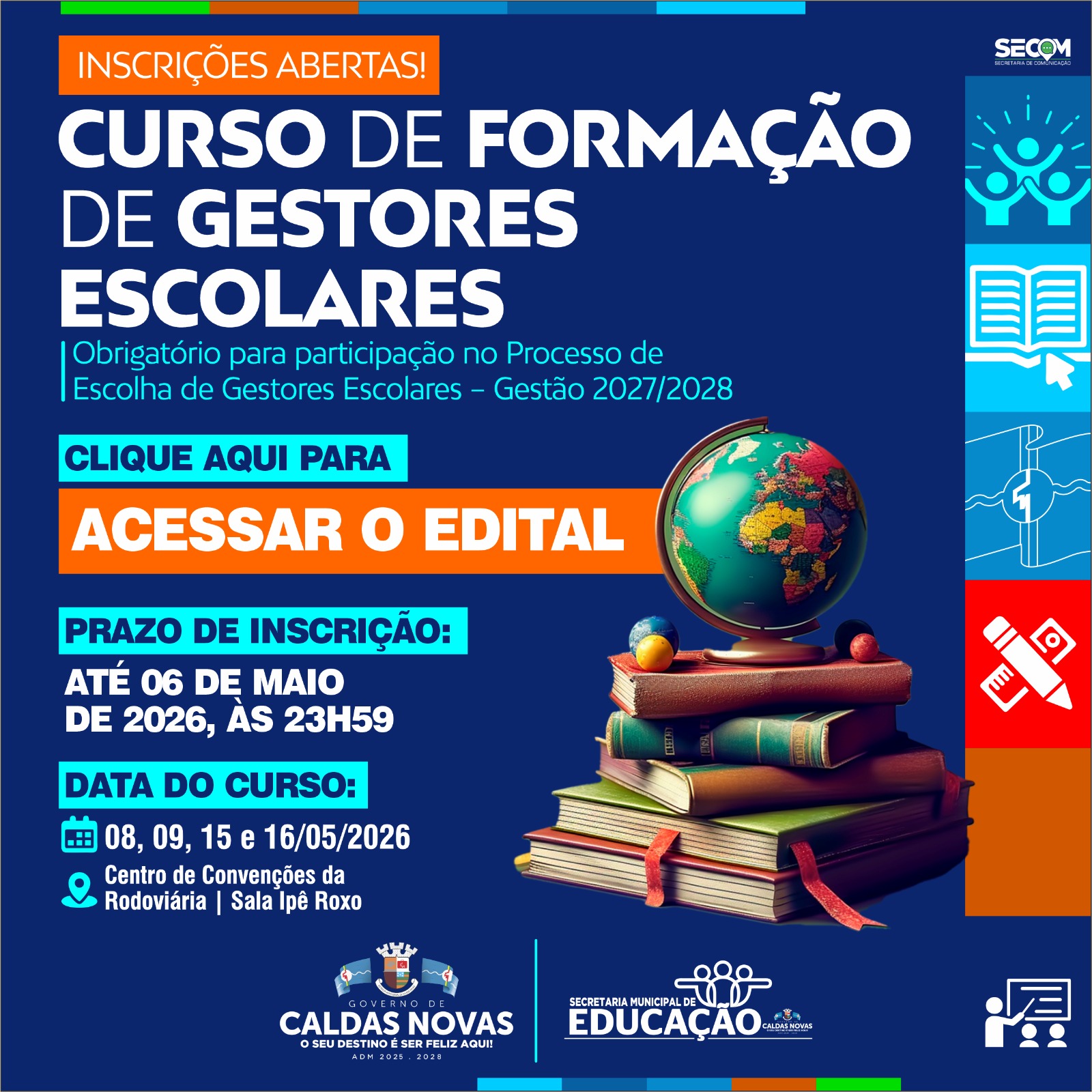 O Governo de Caldas Novas, por meio da Secretaria Municipal de Educação, informa que estão abertas as inscrições para o Curso de Formação de Gestores Escolares, etapa obrigatória para participação no Processo de Escolha de Gestores Escolares – Gestão 2027/2028.